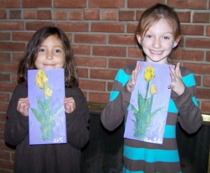 This painting of the yellow tulips is acrylic on hard board. They come up with great ideas of things to paint and are also open to suggestions that I have for them. We try to explore something different each week from composition, to blending, to perspective, to color mixing. Don’t you think they are doing great?