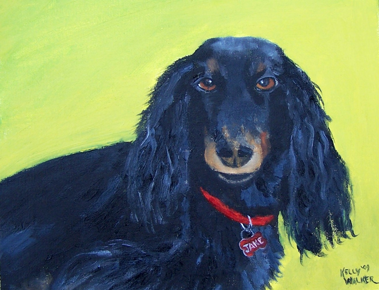 “Jake Walsh” is an oil on canvas panel measuring 8″x10″. He was a Christmas present from his human sister to their mom and dad.