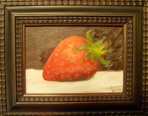 A Red Strawberry is a 5″x7″ oil painting on canvas. It is framed. On sale for $65.