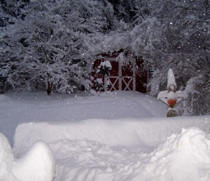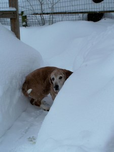 But here we are again. It started yesterday about 9 a.m. with a faint little light misty snow and it hasn’t stopped. It only got harder. And when I measured a few minutes ago we were up to 30 inches!!! That’s a lot of snow.