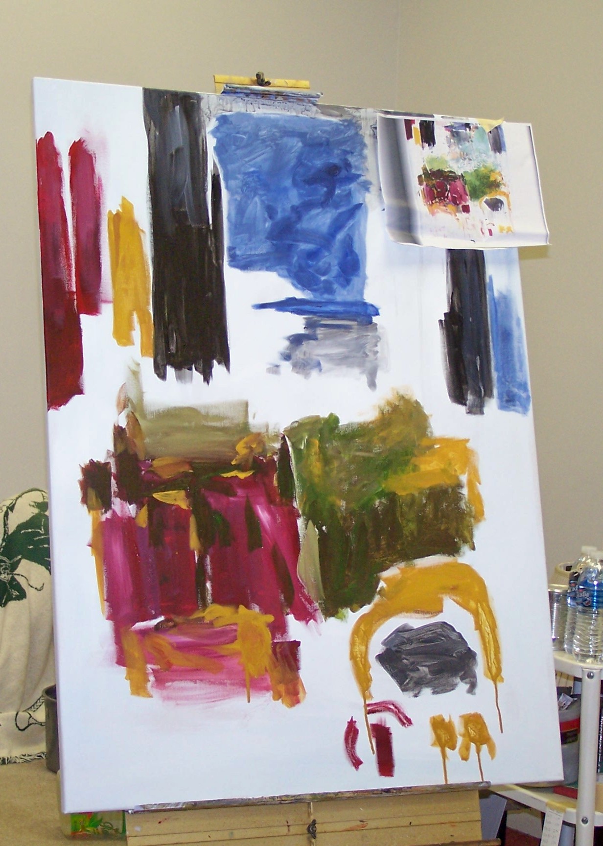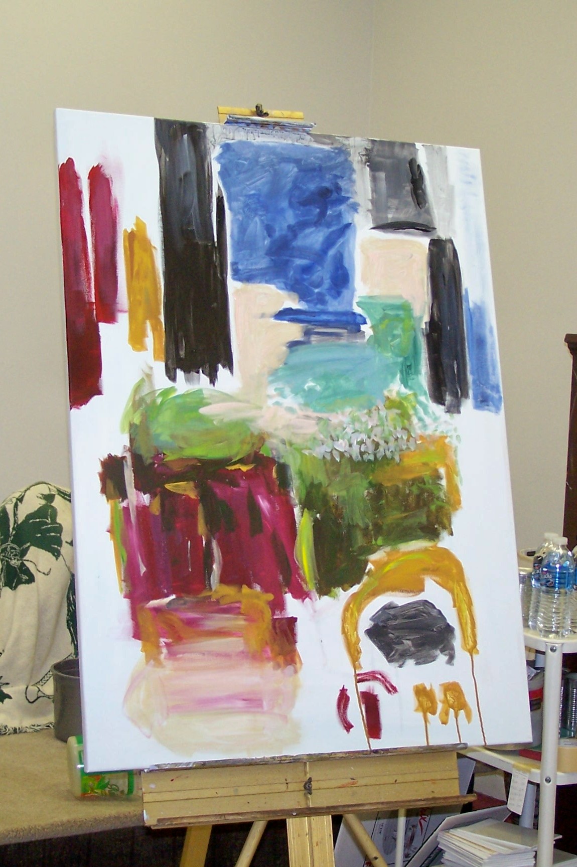 Today’s painting (that is an Ode to Joan Mitchell, a wonderful abstract painter from the mid 20th Century) shows the progress of a recent lesson and the finished painting. I know that abstract is not everyone’s “cup of tea” hence the name of the show, Minds Wide Open. It is sometimes good to take a look at something we don’t think we care for and we see something in it that we grow to appreciate.