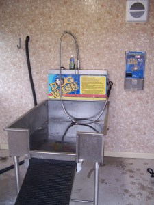 It has an elevated bath tub with a ramp that the dogs can walk right up. Well, more like drag right up because after stopping just one time and bathing them there they have figured out the routine and they don’t want to go up the ramp any more. It is so nice to be able to stand and wash the stink off of them without breaking my back bending over a tub.