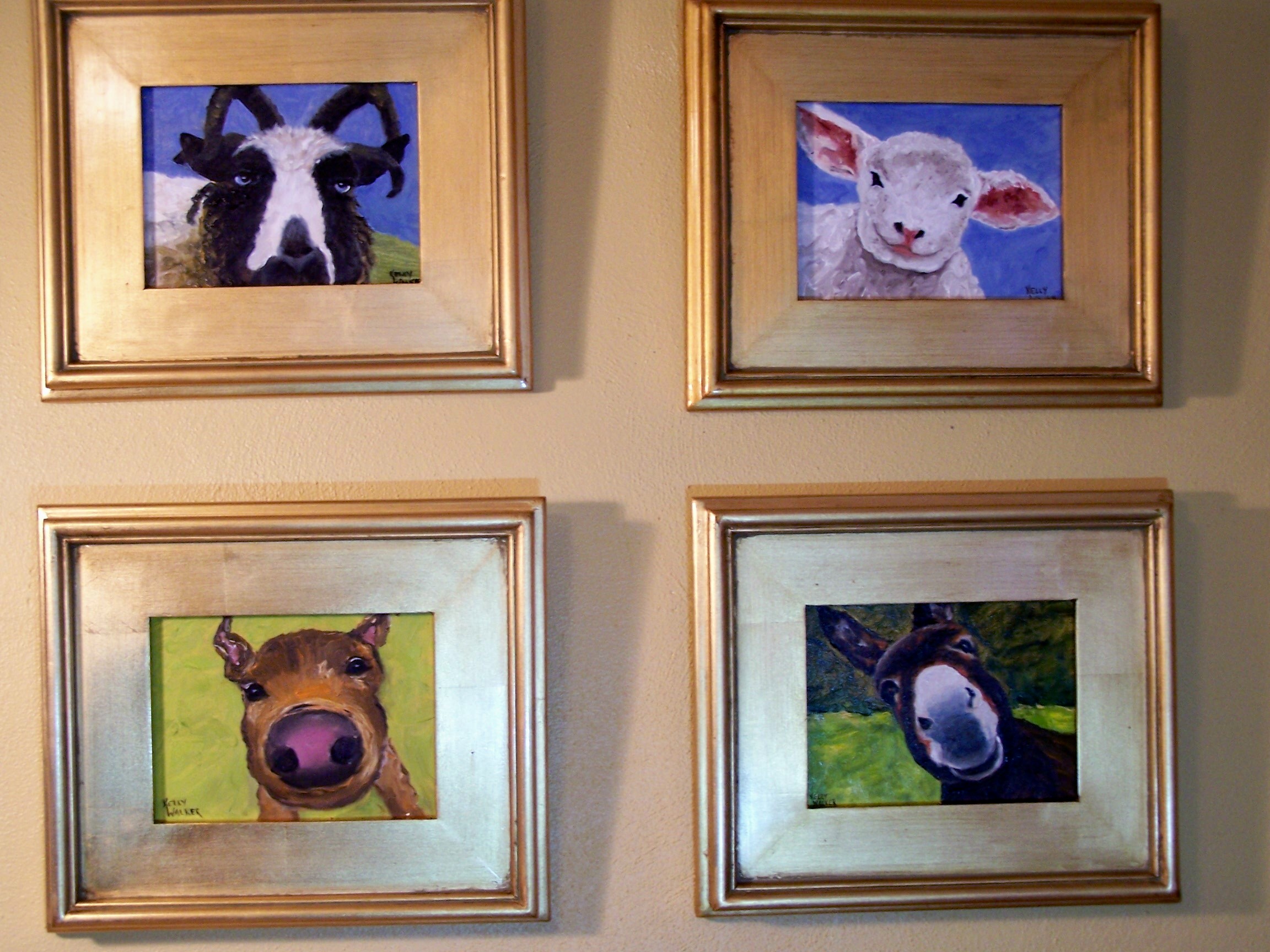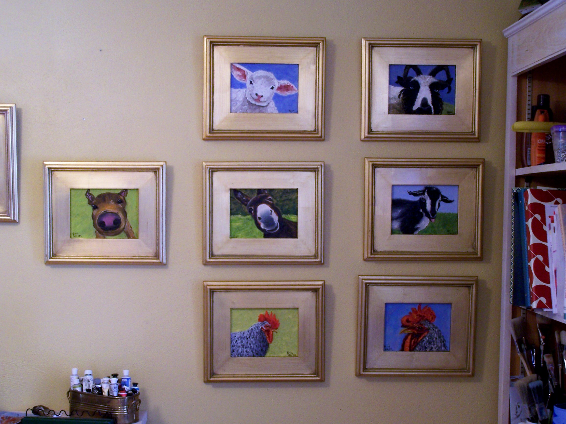 I was asked what I do with all the paintings I create. Well, for example, with the Farm Animal series, I let them dry a little and then I frame and hang them up to completely dry. Next I’ll take them to Delilah’s, my gallery in Front Royal, and exhibit them for sale. And of course, any of my paintings are available through the blog by just contacting me.