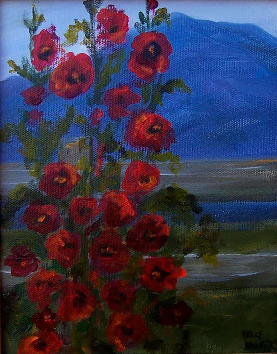 Hollyhocks Mountain View is an acrylic on canvas panel measuring 10″x8″ available for $195 framed. This painting can be seen at the new Main Street Bookstore along with several other paintings.