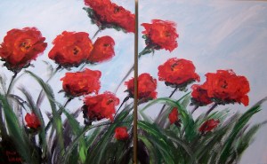 Red Blooms Diptych is an acrylic on gallery wrap canvas measuring 20″x32″. SOLD. This is a painting that I did for the upcoming member show at the Blue Ridge Arts Council.