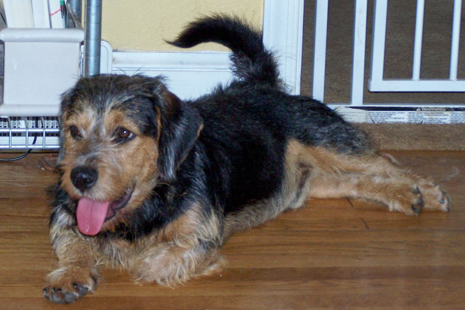 I think (and my vet agrees) that he is a Dachshund/Airedale Terrier mix. Not sure how that happened but it must have involved a ladder.