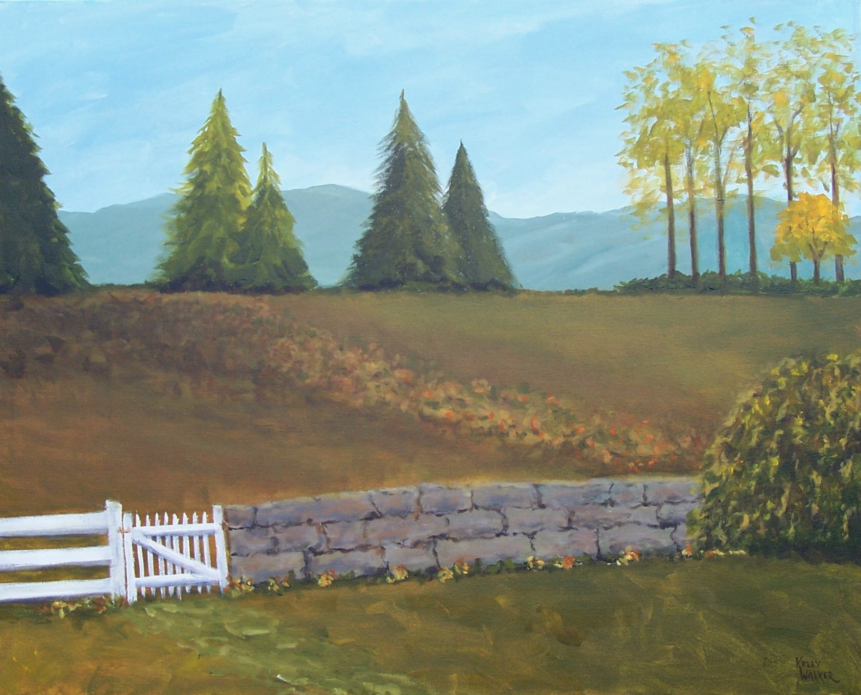 Stone Wall with Picket Fence, acrylic, 24″x30″, SALE PRICE $185