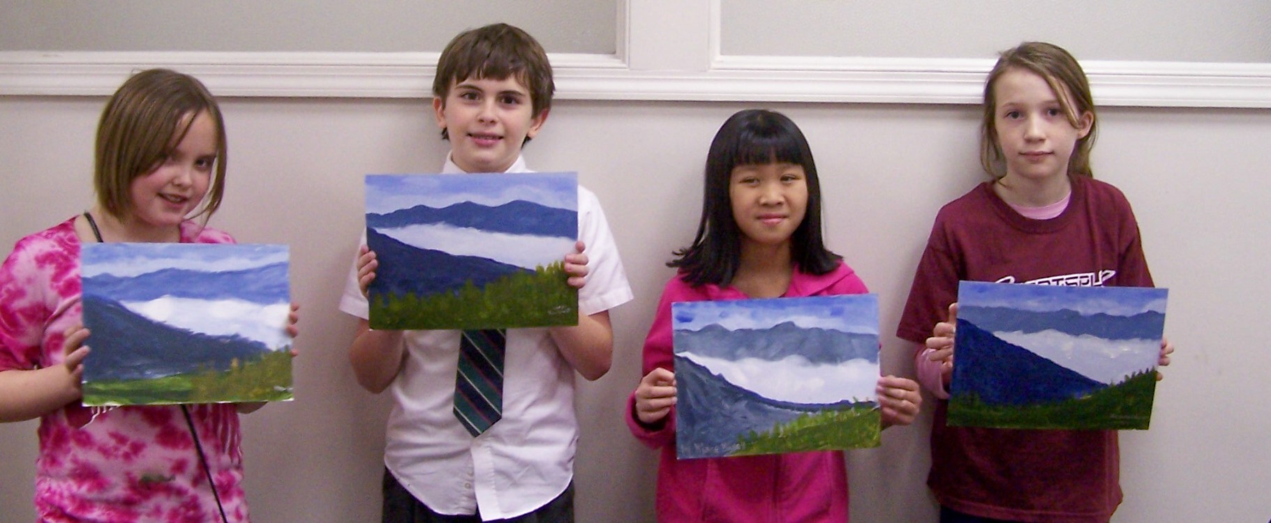 The Wednesday Young Artist class painted a wonderful landscape of mountains with low hanging clouds. This was a free-form lesson where they followed along as I painted. Can you imagine they did this in only an hour? I’m not sure if they are just great artists or if I’m a good teacher! 🙂