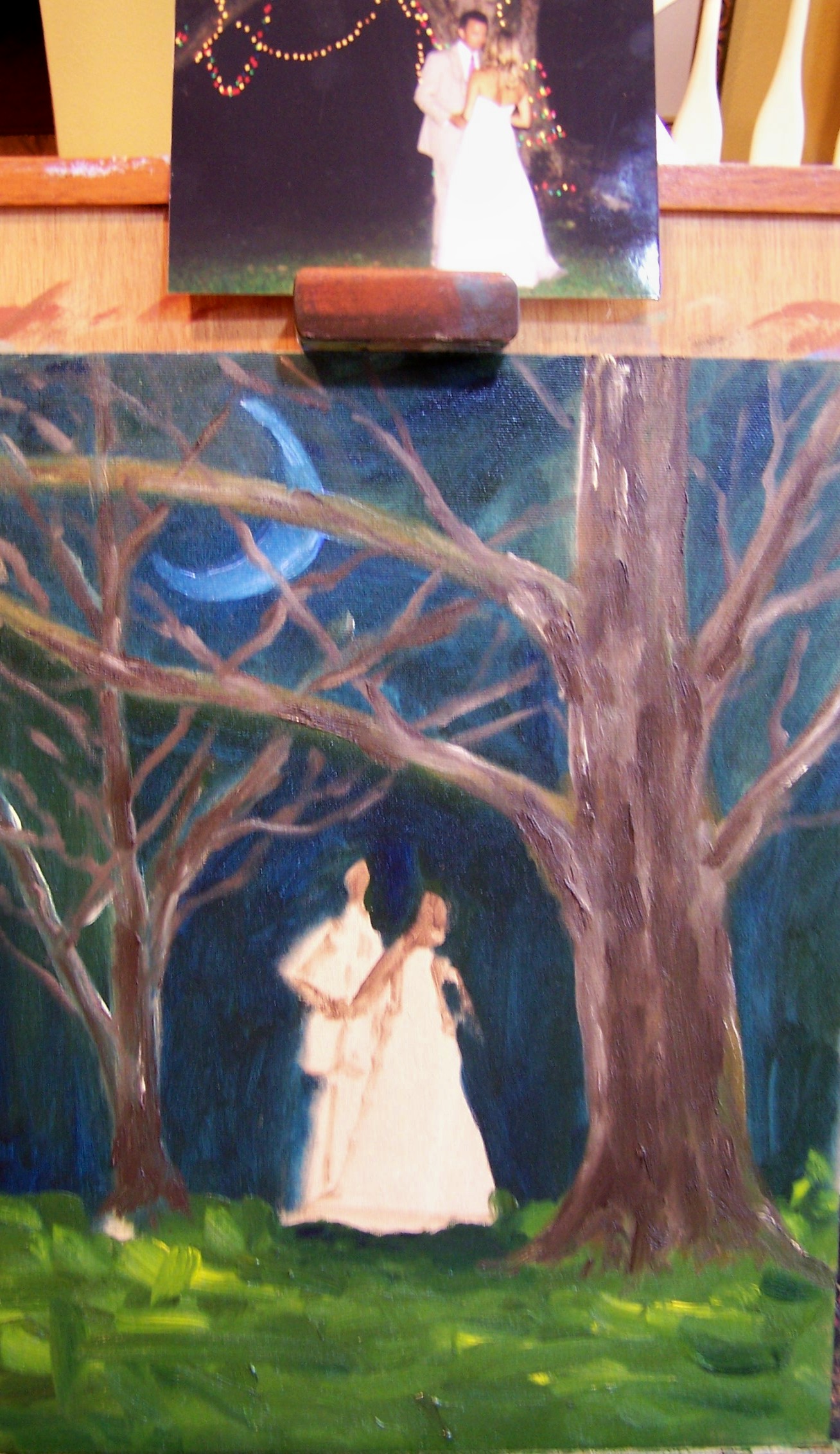 Several months ago I got a commission for a painting as an anniversary gift from a man for his wife. It was a photo of their wedding dance. But he also wanted it to reflect a favorite book that they had.