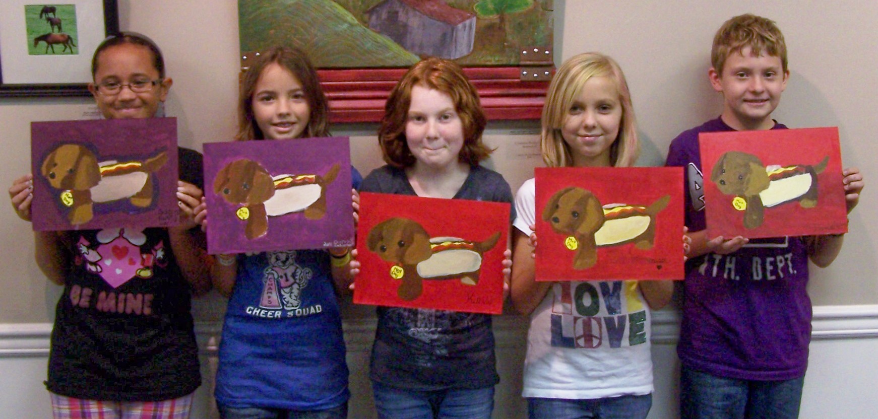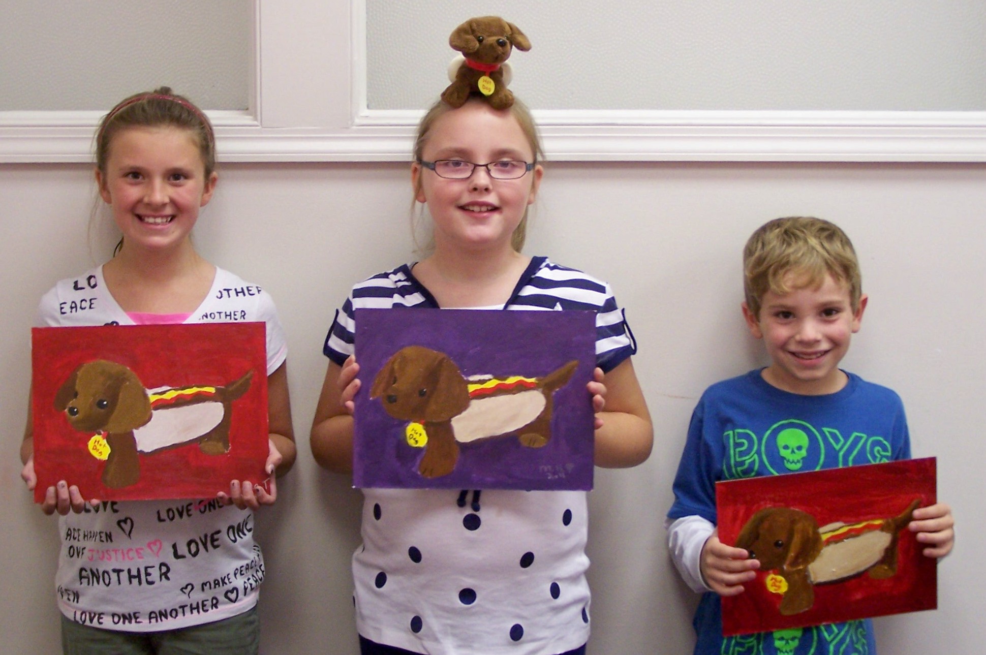 A few months ago Maggie brought in this cute little stuffed toy – a dachshund with a hot dog costume on. So we photographed it and finally got around to painting it in class. If you look closely at Maggie in the photo you can see the toy on her head! This was a great lesson for the painters in shading. They all did a great job!!!