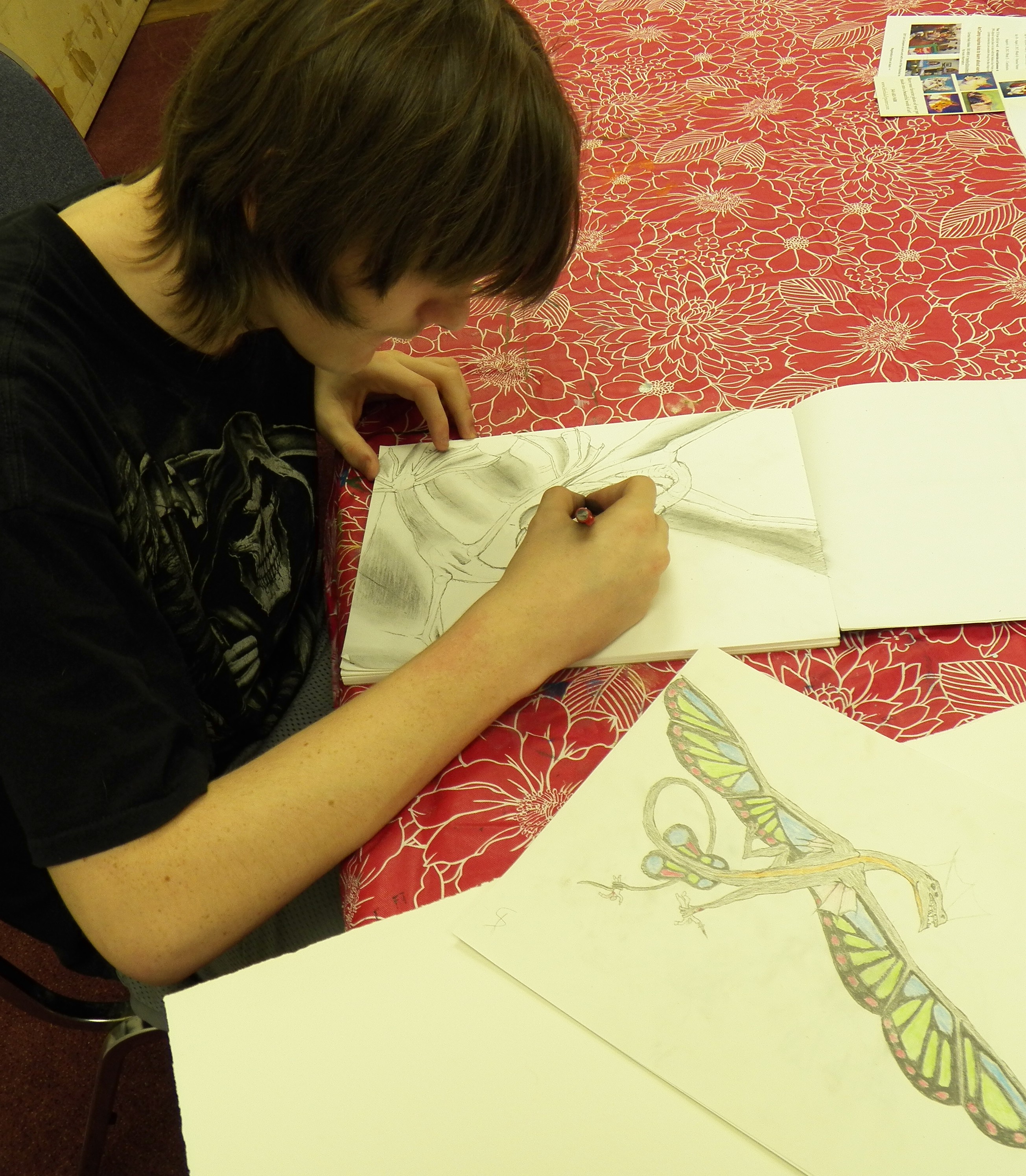 I also have young artists who are a little too old for the Young Artists classes so they join us for adult classes on Wednesday or Thursday from 5:30-7. These classes allow students to develop their skills while working on a subject of their choice while receiving individual instruction. This is Liam, a new student who had excellent drawing skills, working on his fantasy drawing.