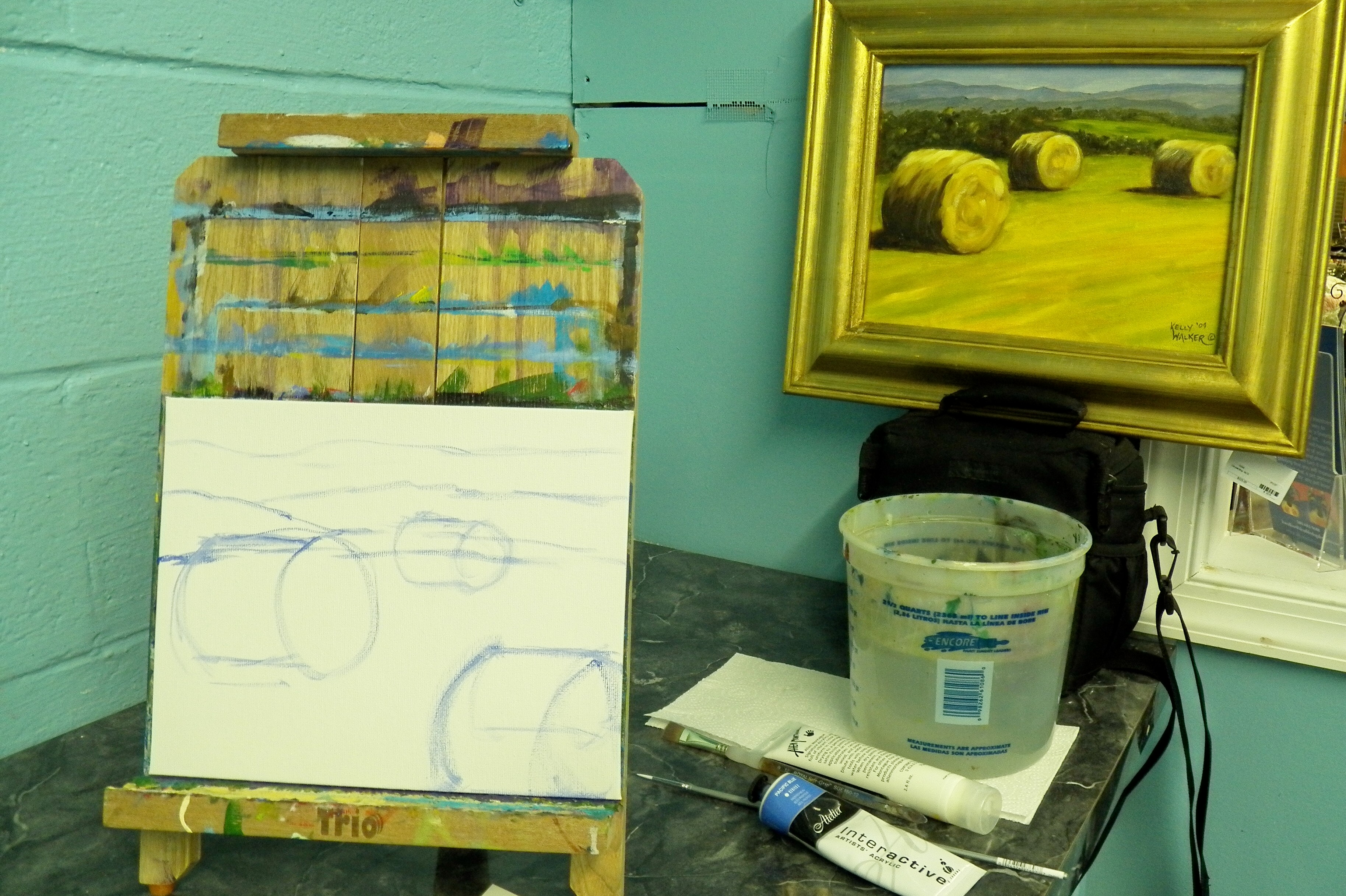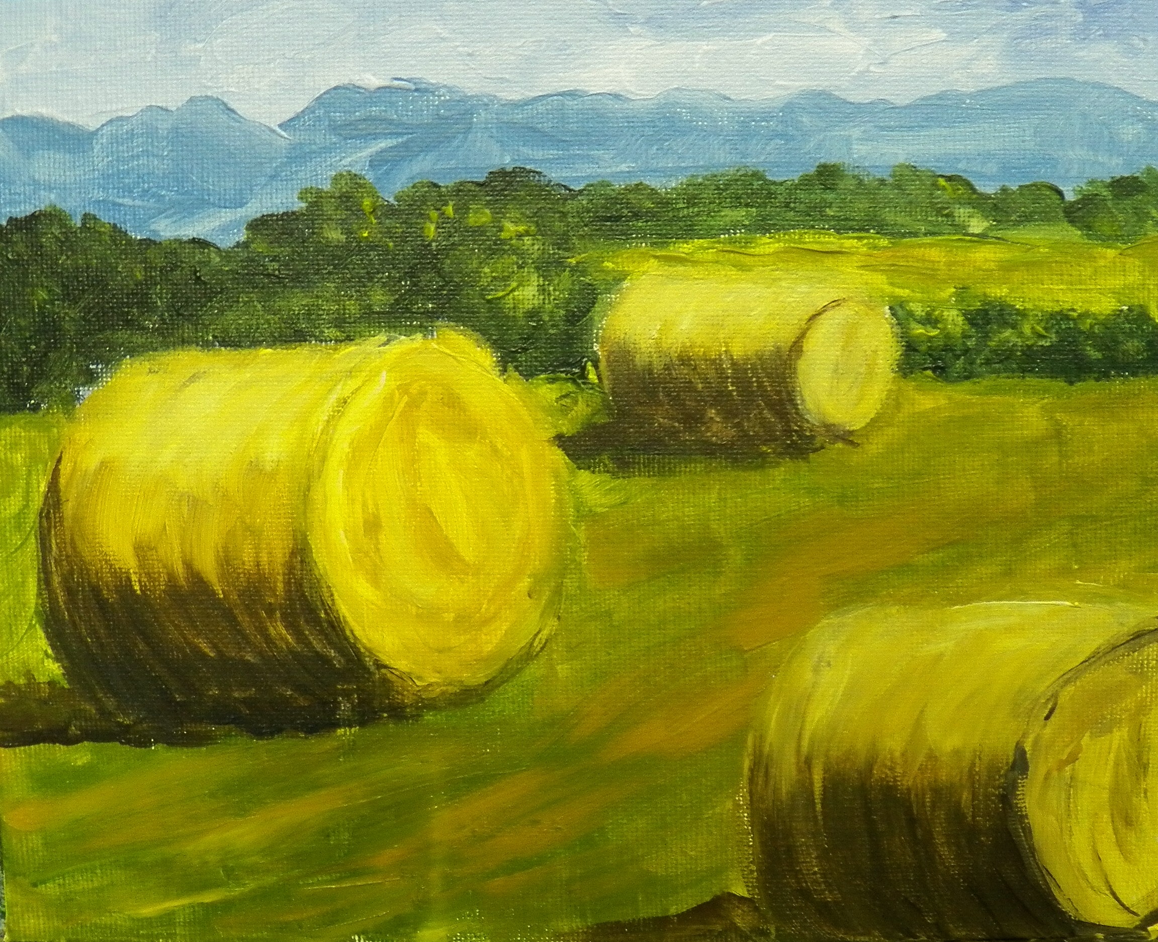 On the last Tuesday of the month we have an art workshop at Buggy B’s in Strasburg. And this past Tuesday we worked on this painting, a glorious summer day with hay bails.