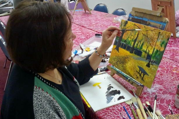 This is Kathy. She is one of my Wednesday morning students. And while she’s only been painting for a short time she is doing a fantastic job. Don’t you think. She painted this gorgeous fall scene over the last few weeks and made it look great! Good job Kathy. Keep it up.