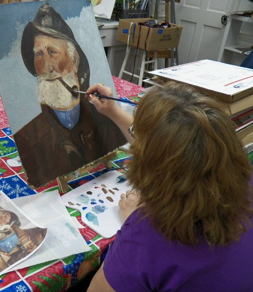 Cathy reworks an old painting she recently acquired.