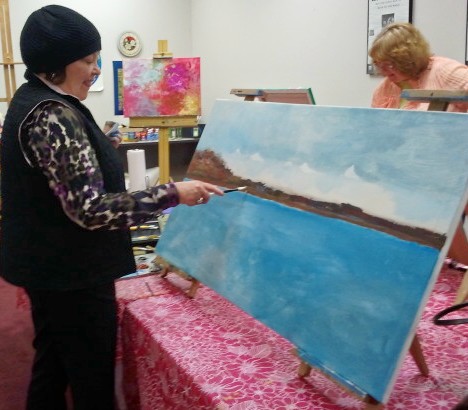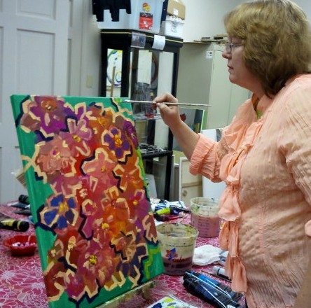 At the Wednesday morning Adult Art Class Kathy came in with this large canvas and an idea for a large representational abstract. She hasn’t tried abstract before so we all decided to try something different.