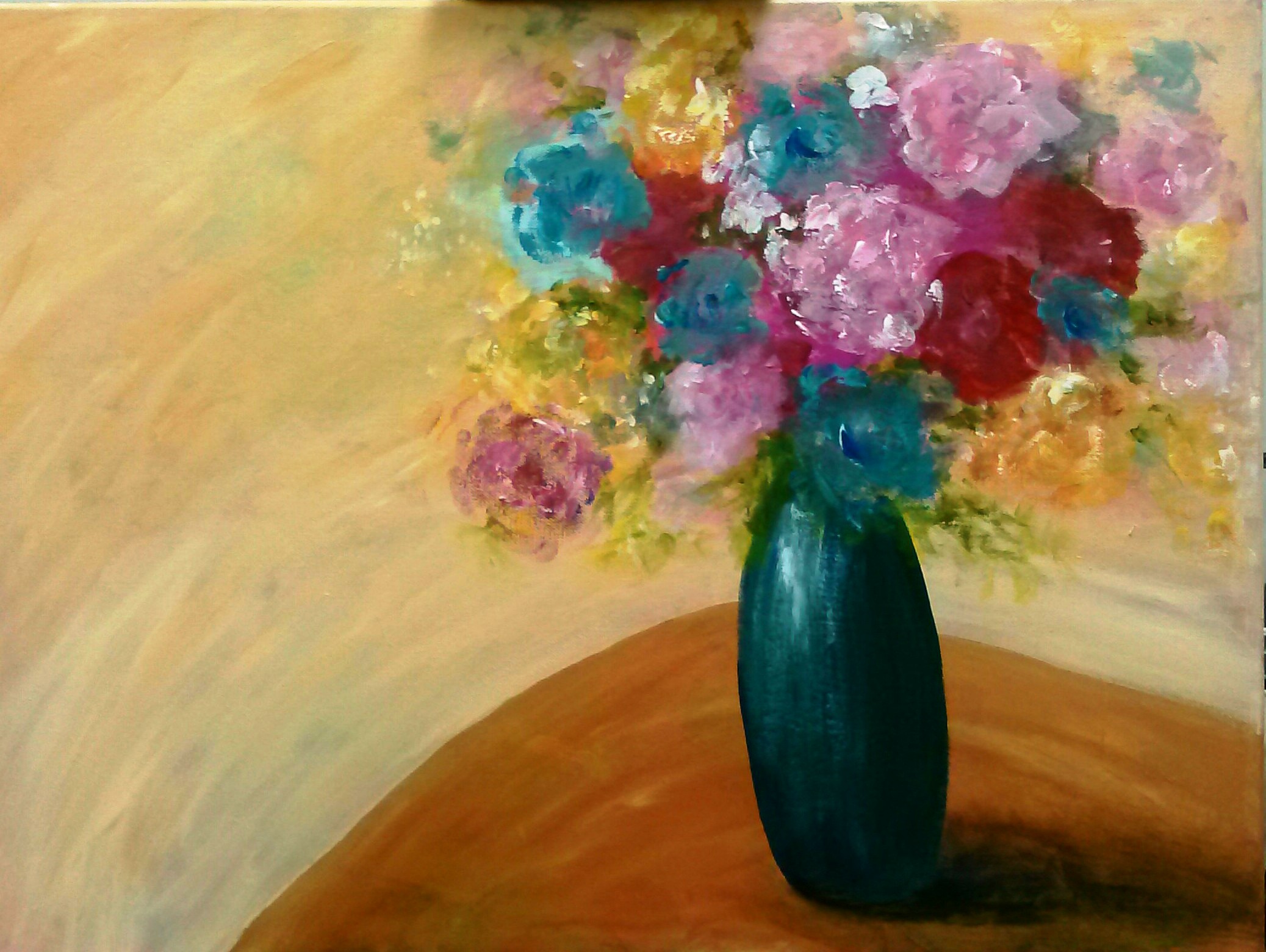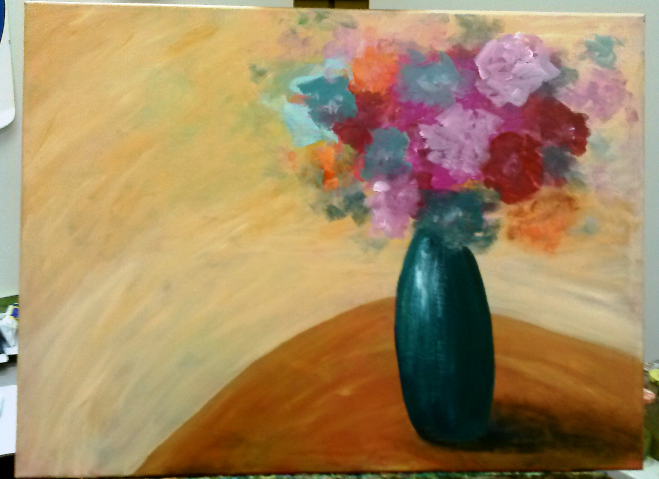 Next I started thinking about where I wanted to add a vase of flowers so that I could paint in a background all around where the flowers would be. And I added a vase and started firming up the shapes of the flowers. Tonight I hope to continue putting in details that will finish it off as a “representational abstract” painting.