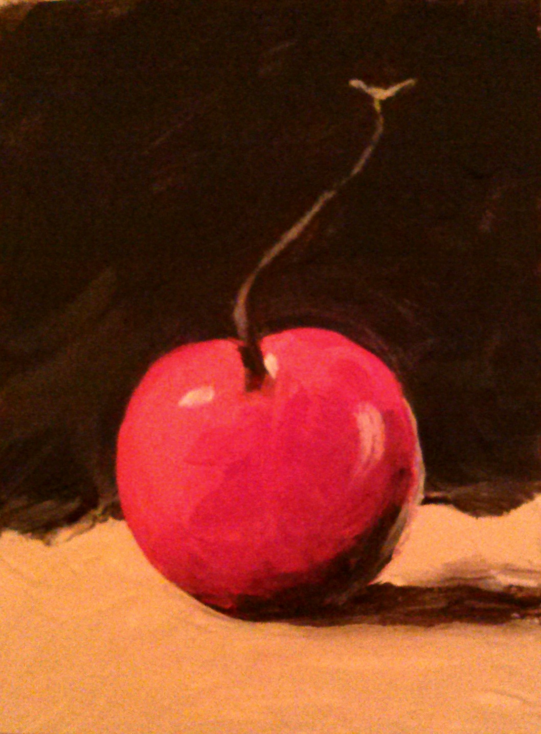 “A Little Cherry Miniature“, acrylic, 3″x4”, available framed for $49.