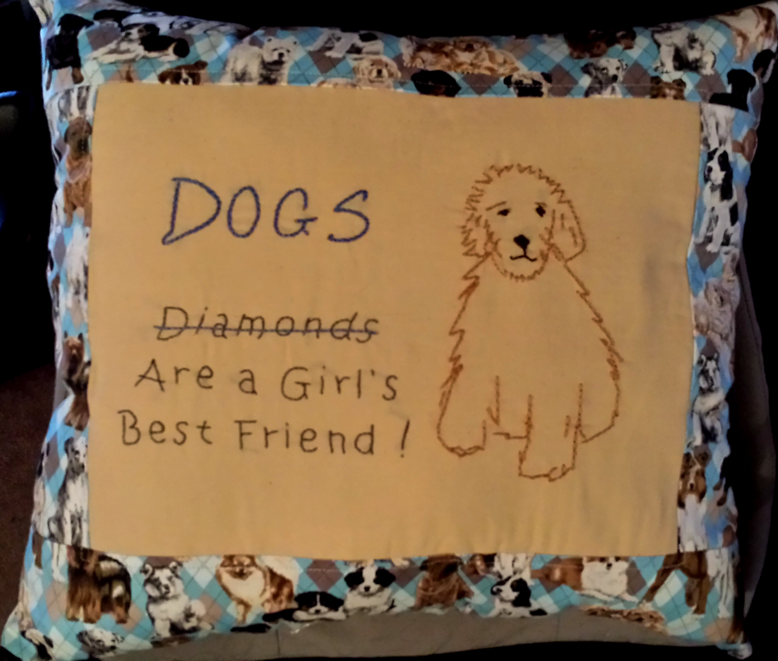20141117_065843I love Facebook because I am always seeing cute sayings that people post.  I saw this one a few weeks ago and thought it would make a cute embroidery pattern if I added a little dog to it.  So here it is on a pillow.