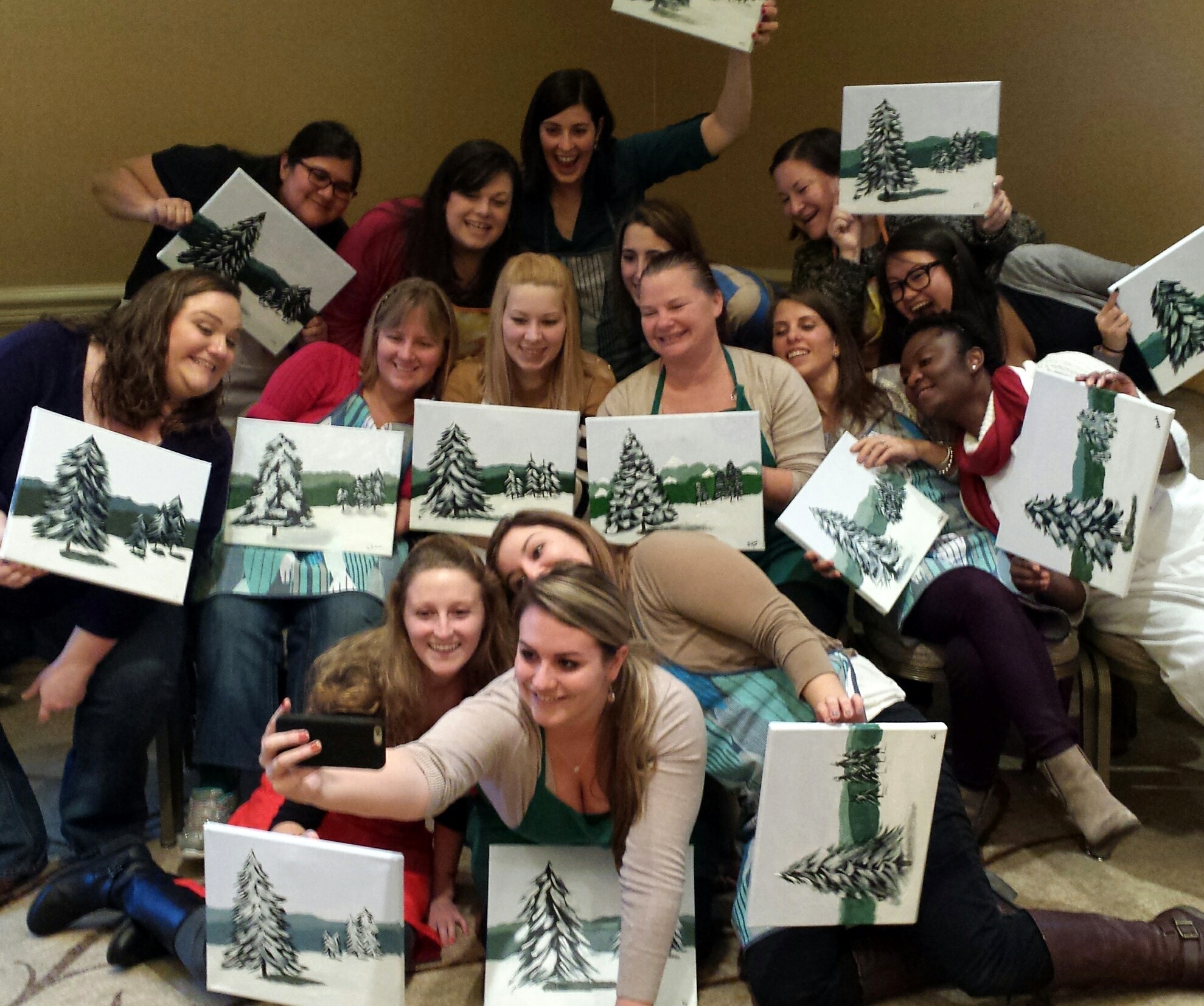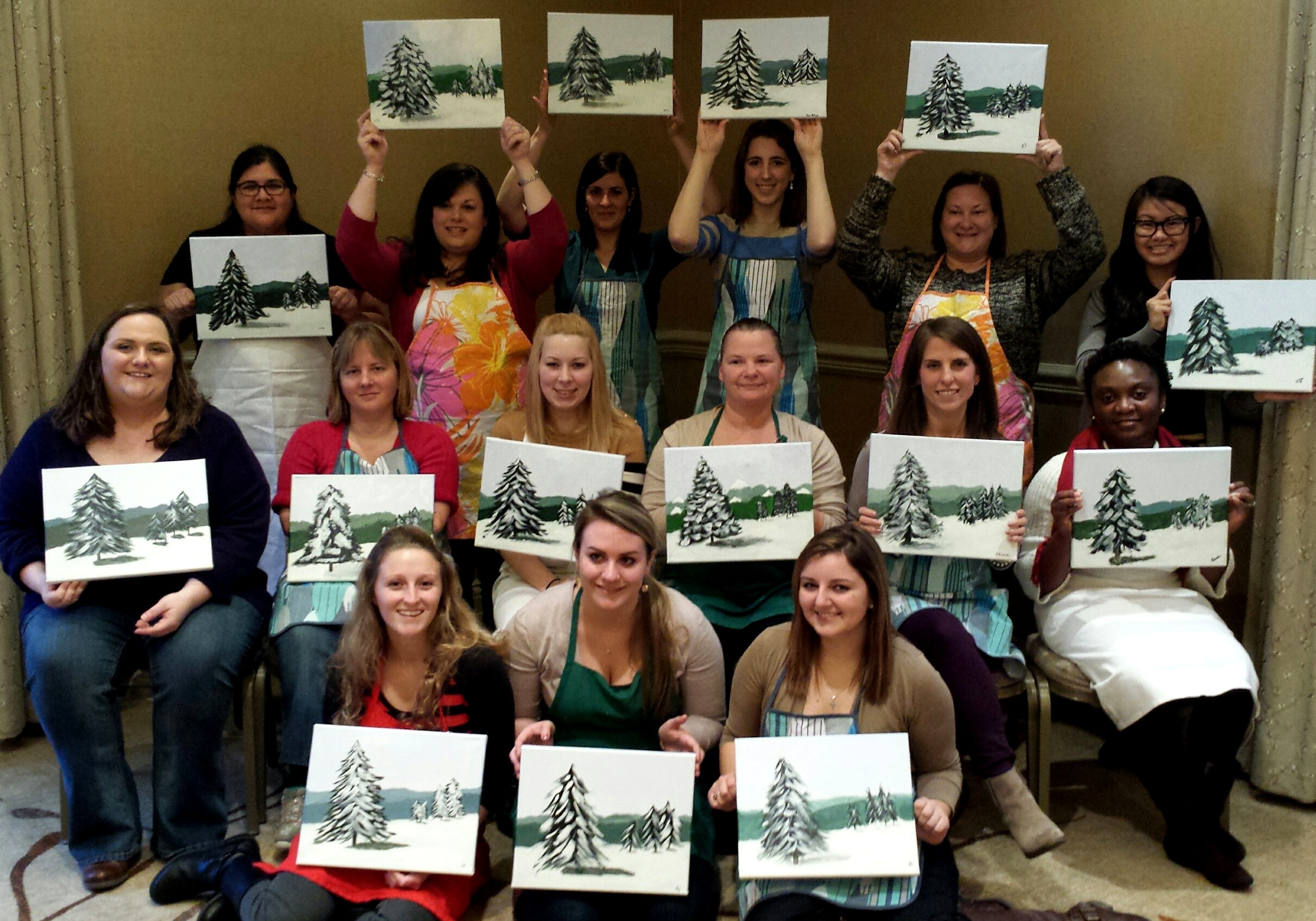 We painted a lovely winter scene with snow and trees and they all did a FABULOUS job! They were an enthusiastic and delightful group…but what could I expect when you get 15 A-type personalities together to paint. It was spirited! Great work everyone.