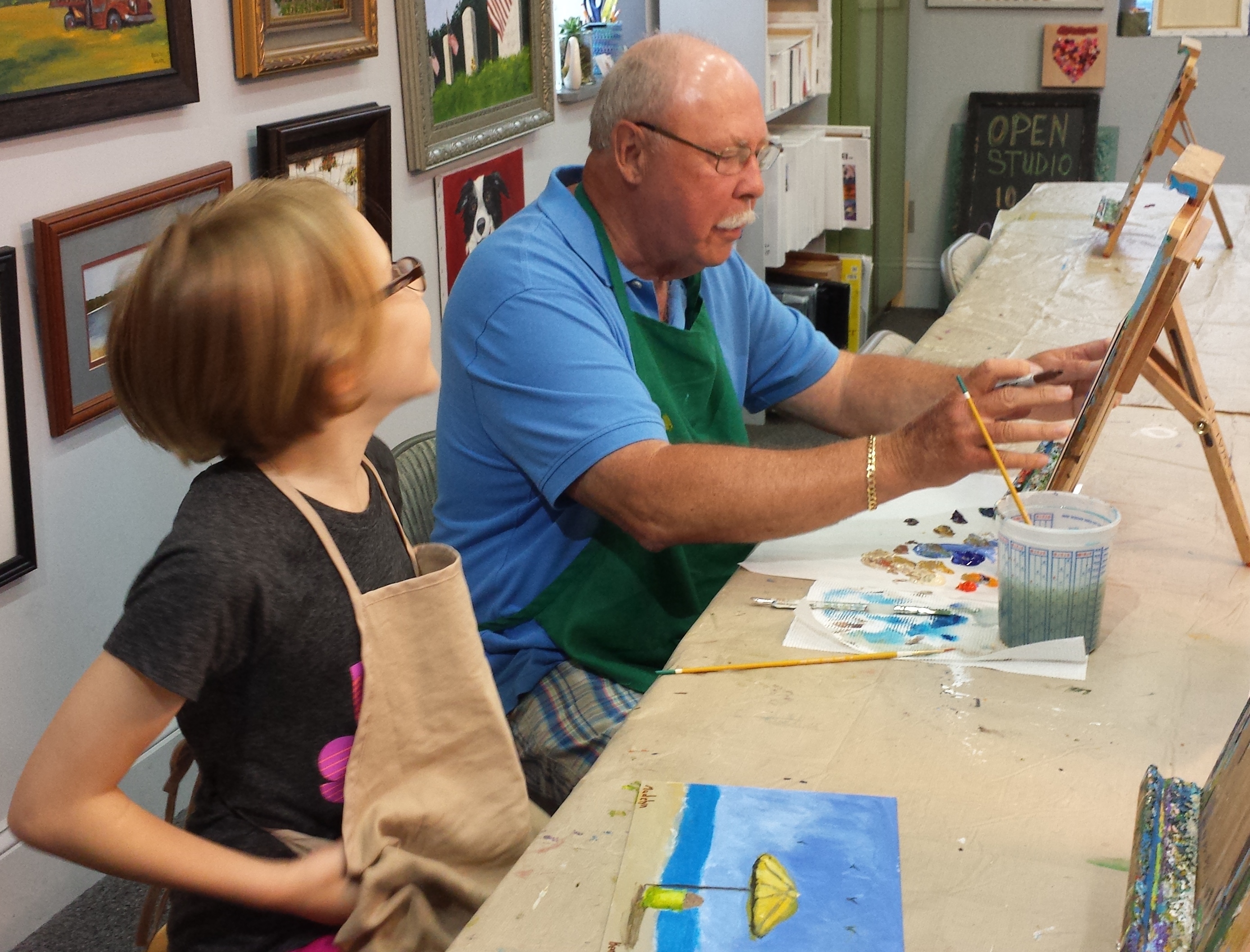 This week he used his gift to paint with one of his granddaughters….one who has taken classes and art camp with me before. So Maddie and Jim painted these wonderful beach scenes. Maddie helped Jim learn about color mixing and painting. They were so much fun and adorable together. So glad they had a fun time and created this great memory at The Studio. Nice work!