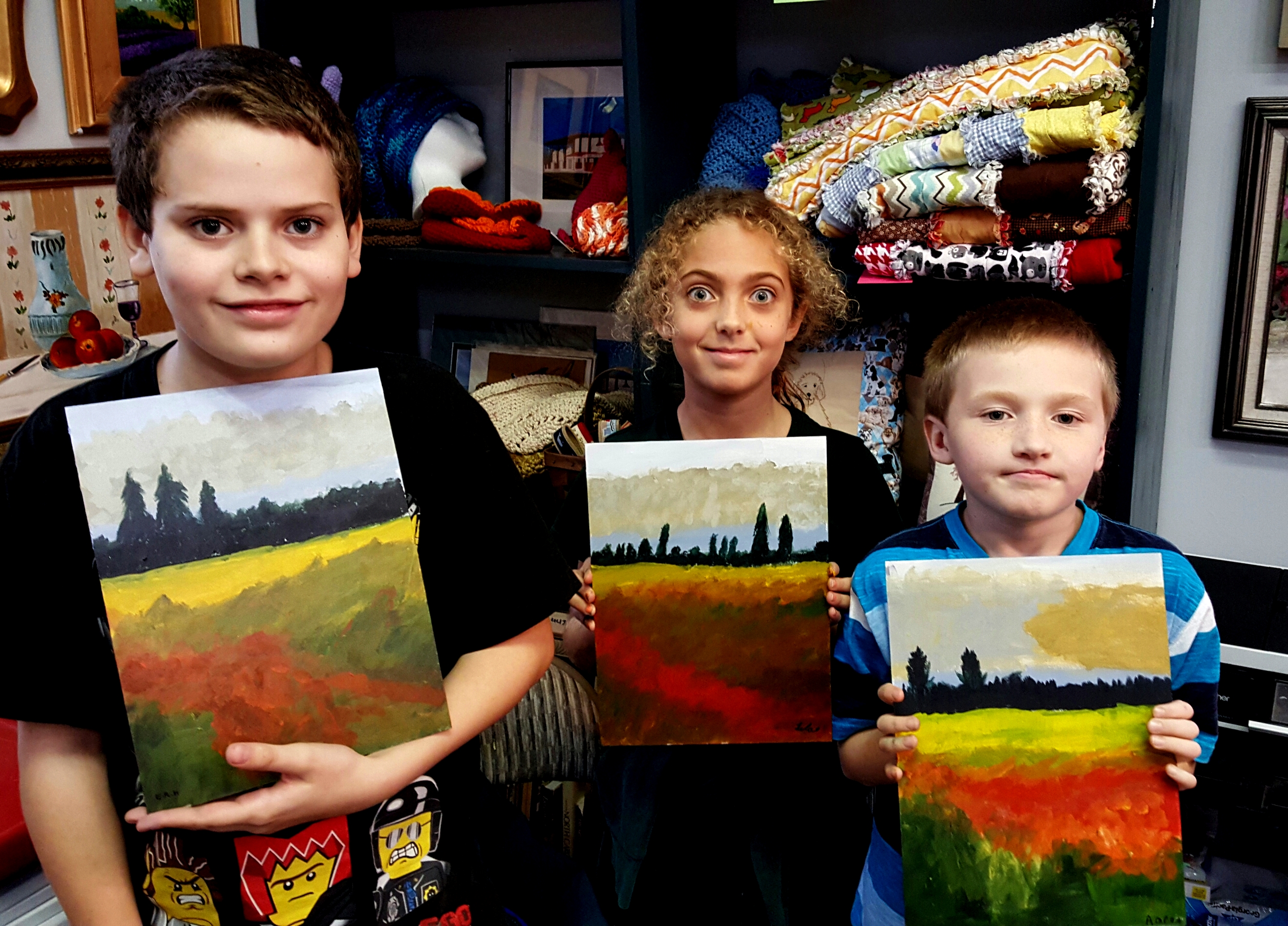 Last week the kids painted this lovely fall color landscape. They enjoy painting but I think they enjoy even more picking on each other when we take our photo at the end of class. So silly!