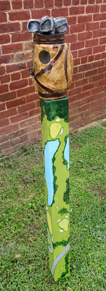 What I love best about these Garden Poles is that you can paint one in almost any theme….so you can create the perfect gift. This one, in a golf motif, is for Allen’s birthday. I found the top, a birdhouse with a golf theme, and painted the pole to go with it. It was fun to put together. Start thinking about who you need to create the perfect gift for as the holidays will be here before you know it. We have a class coming up on November 15th. You too can create the perfect gift. Click the link to see other themes that have been done recently. They are terrific….cats, horses, etc. So many ideas! Click here to register and for more info.