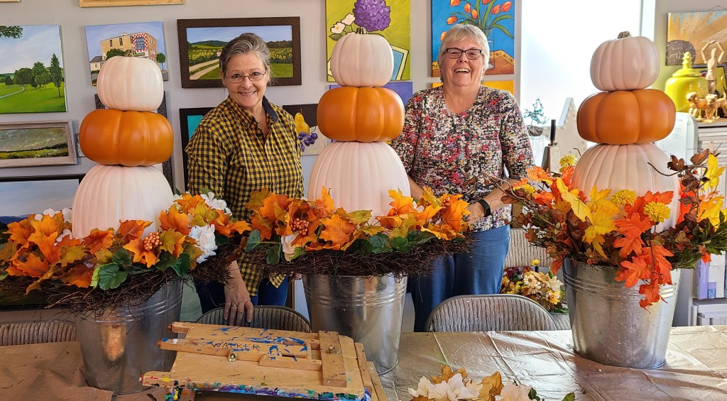 Left to our own devices on a Sunday afternoon with no class scheduled Wilma and I got into all this trouble with pumpkins. Linda did too but hers isn’t quite done so we’ll share it later. It’s Fall Y’all!