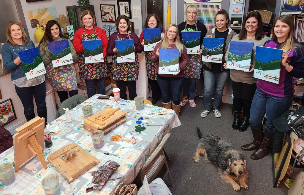 A large group of teachers and friends got together to paint a little snowman landscape yesterday afternoon. Lots of painting, lots of laughing, and lots of fun! And, of course, Lincoln was in heaven making his rounds to be sure everyone had an opportunity to adore him. Nice work ladies. Can’t wait till the next time.