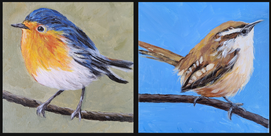 Yesterday I started a little Bird Series that we will be painting over the next few months at The Studio Paint Parties. The first ones I painted are the Eastern Bluebird and a Carolina Wren. We plan to do these little series on 8″x8″ canvases so it won’t take long to do each one and they’ll make a nice little grouping if someone wants to do them all….or you can pick and choose your favorite to add to your art collection. Can’t wait to do more of these. We are starting with the little Eastern Bluebird on Thursday, June 10th at 6 pm. Click here to register. Space is limited. And then we will paint the Carolina Wren on Thursday, July 1st at 6 pm. Click here to register for the Wren.