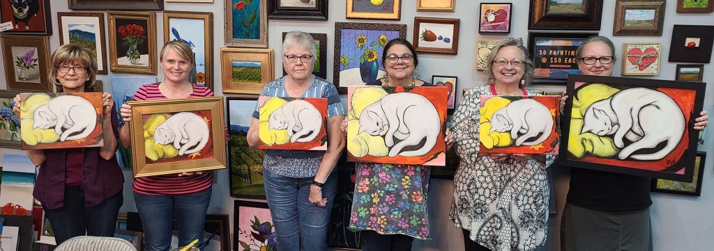 We had a great group painting Franz Marc’s Sleeping Cat last night at The Studio. Nice work all around. We have some exciting events coming up. Check them out here. And join us soon for the fun!