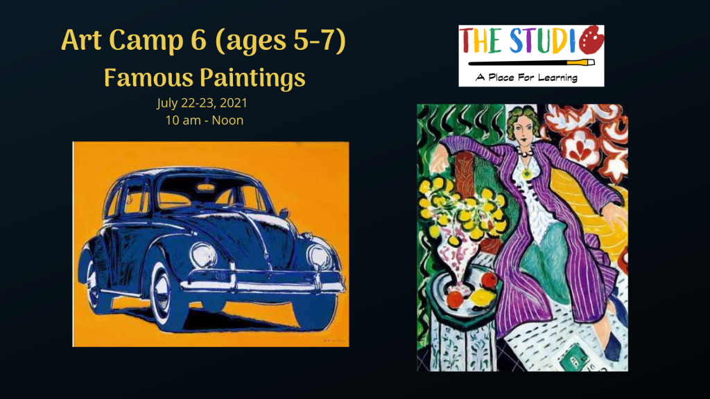 What a great line-up we have for this year’s Summer Art Camp for Kids. Check out the terrific paintings we’ll be creating and sign up your 5-7 year olds and 8-12 year olds for these great sessions. Click here to download the registration form or click here to register online. They’ll LOVE it!