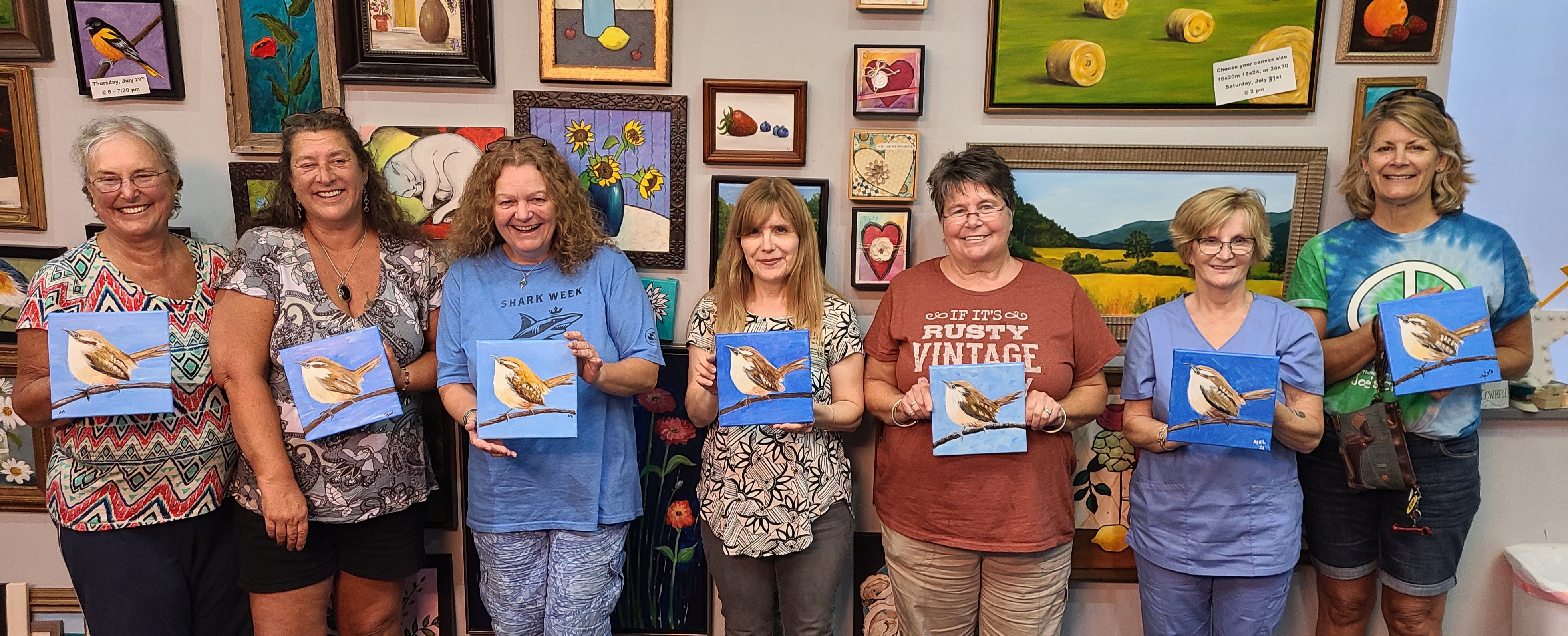 We painted the second bird in our series on Thursday evening….the Carolina Wren. This cutie turned out great! Everyone did an amazing job. I think this is the most difficult one in the series but these painters didn’t have a bit of trouble. Don’t they look great?! And we had many laughs discussing what the Carolina Wren actually says…..is it “Cheeseburger, cheeseburger, cheeseburger” or “Teakettle, teakettle, teakettle”? LOL If you want to join in the fun painting at The Studio check out the upcoming painting events here and come out soon to paint with us.