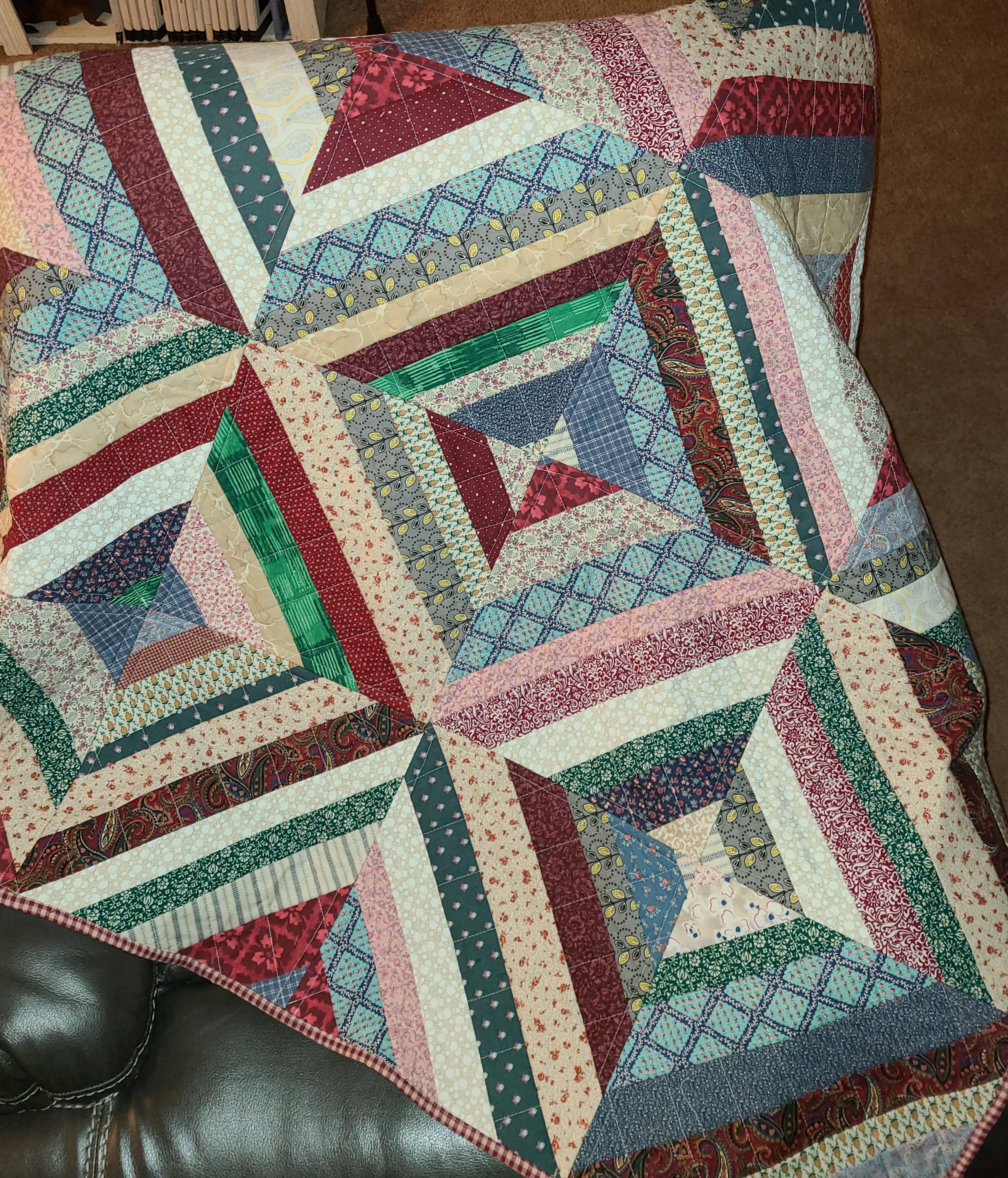 I am not sure whether to thank or curse the day I discovered a YouTube video on Quilt As You Go (QAYG). I wish I could remember where I first saw it but it was probably on Facebook but I had been wanting to do some quilting but I don’t have a long-arm machine and when I had tried in the past to quilt on my “regular” sewing machine it was just too bulky to work well. But then I read about QAYG…..and I am hooked. It is addictive (or maybe it is just my personality that becomes addicted to fun projects). It is so easy and fun and looks great!!!! These photos are the front and back of my first QAYG quilt. It’s a String Quilt made from a box of scraps that I was getting ready to throw out. I’d gone through the box a few times and pulled out larger pieces but these were all very small and had been sitting in a closet for several years and I wanted to clean out the space. So before I tossed the box I thought why not see if there is a project that might work….and I found this String Quilt idea…..and I LOVE IT! As you can imagine, I have LOADS of ideas for other quilts to make. Can’t wait!!!