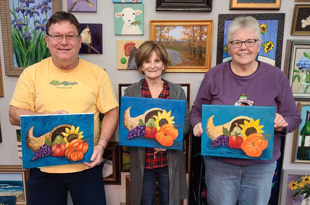 These artists did a great job painting their cornucopias yesterday at The Studio. What fun to do a challenging painting and something we can enjoy for this Fall and Thanksgiving Season. Great work everyone!