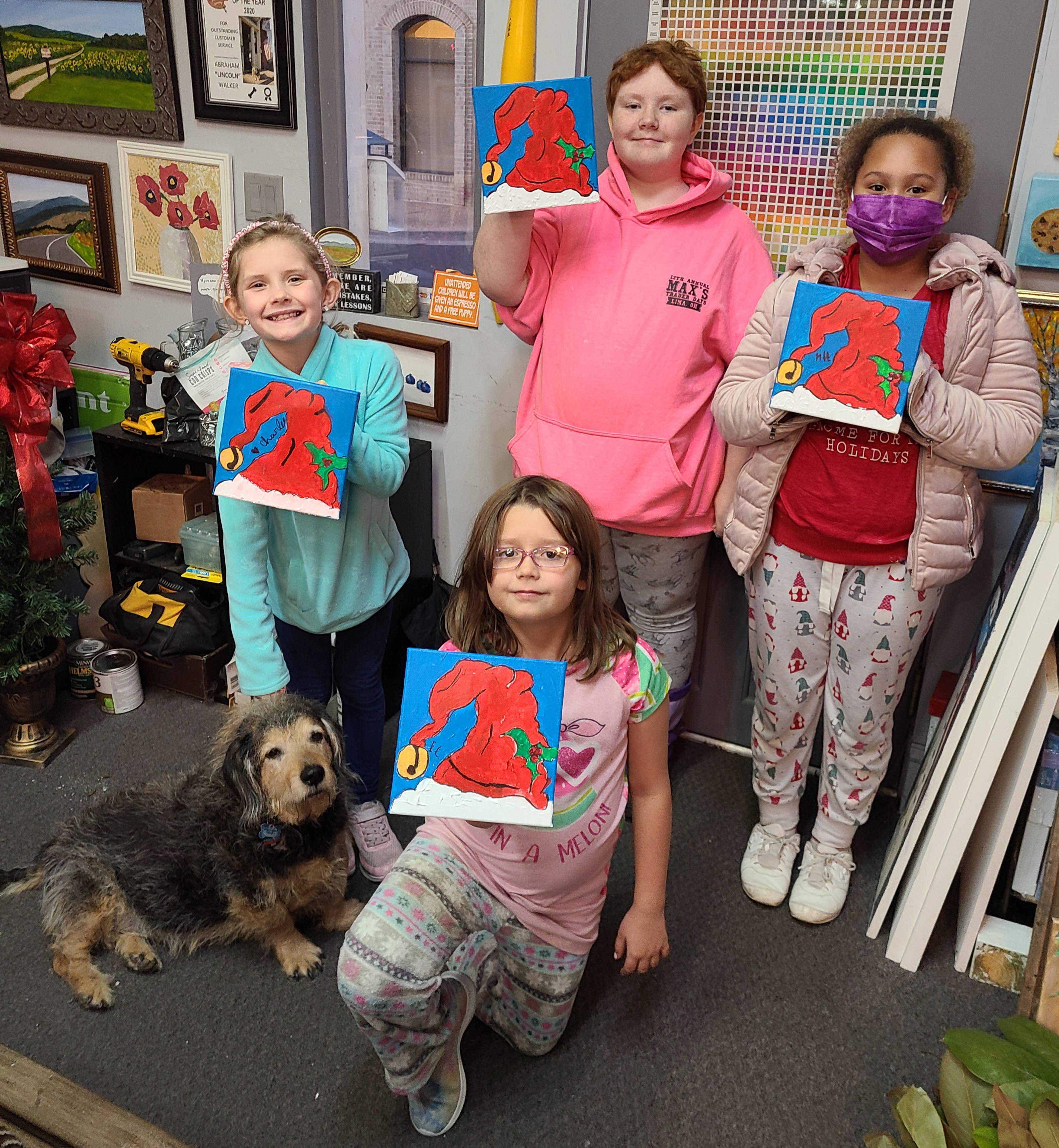 The kids painted these adorable Santa Hats at our last art class of the year. Beautiful work…and thanks Denise K for giving us the idea. Super cute. If you have a young painter who would like to join us be sure to contact Kelly and sign them up for Wednesday Kid’s class. kwalker@kellywalkerstudios.com
