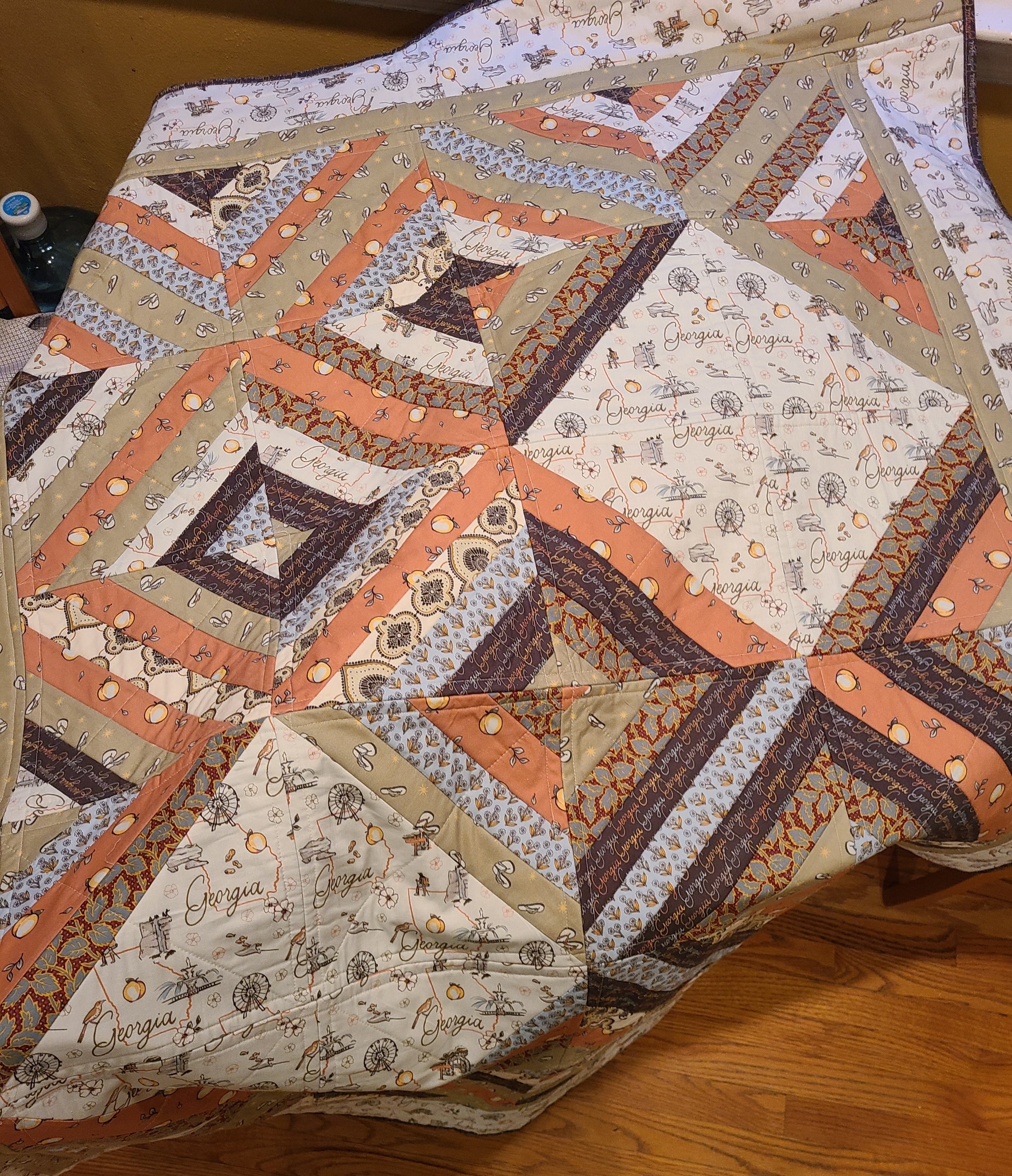 For the last few months I have worked on quilts for Christmas gifts. Even though I live in Virginia now I will always be a Georgia girl and while shopping at Joann’s Fabrics I saw this “Georgia State” fabric. I asked the clerk why they had Georgia fabric in Virginia and she said she suspected that some store in Georgia must have a shipment of Virginia fabric. LOL! I bought enough to make quilts for several family members back home. They all liked them. I loved the fabric designs with peaches, flip flops and outlines of the state. Take a close look.