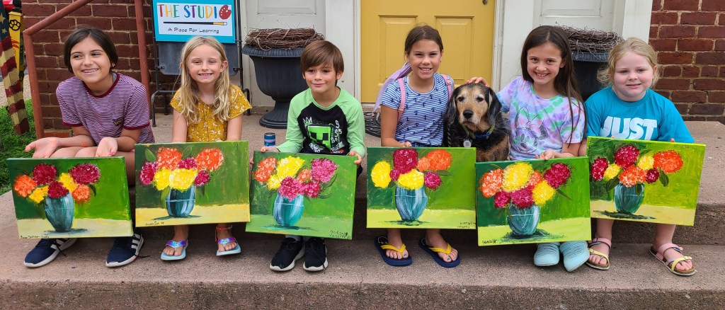 At the final day of “Nature: Flowers and Trees” Art Camp we painted a vase of representational abstract flowers using three techniques. First we painted the background and vase with brushes. Then we used paper towels to lay in the flower shapes. Then we finished them using finger painting. Boy, was that fun!!!! Great job by this group of young painters. We have just one session of Art Camp left this summer and it is for ages 5-7. Click here to register your young painter.