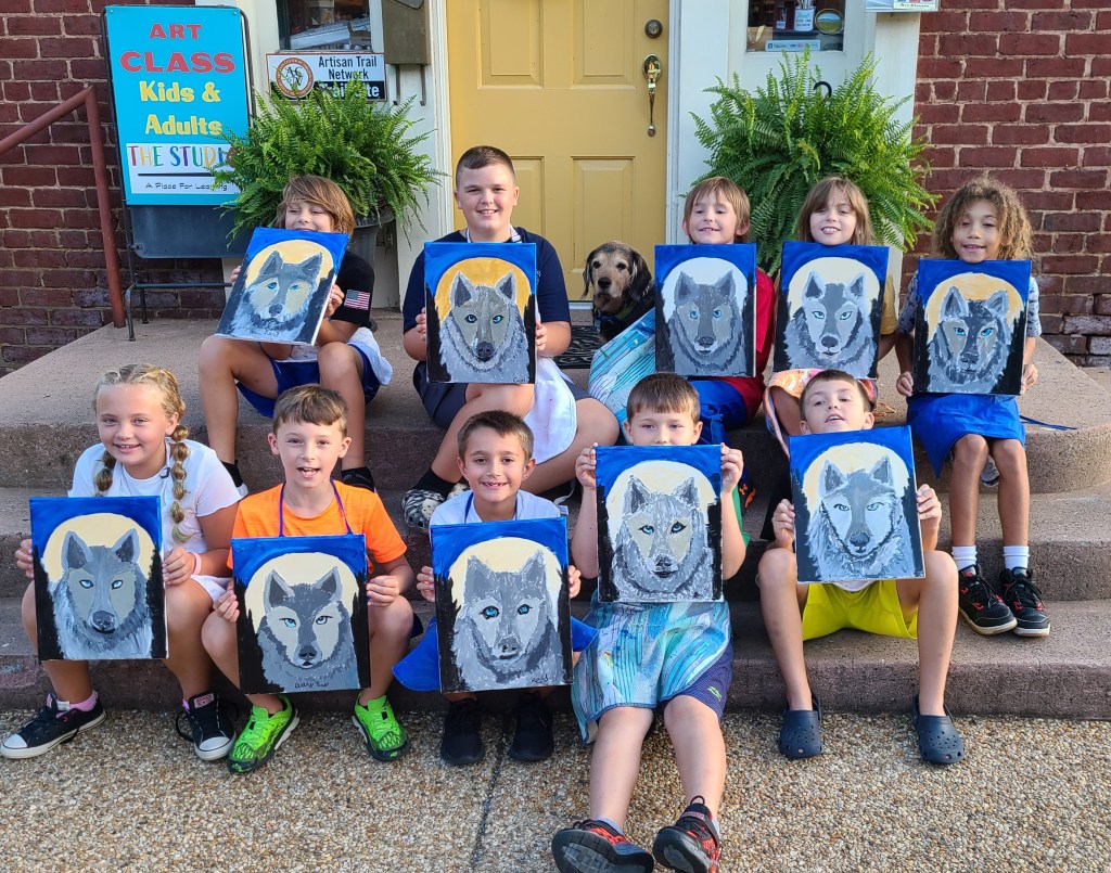 Birthday Boy Easton (sitting to the right of Lincoln) held his birthday party at The Studio yesterday evening. He asked to paint a wolf. And paint they did! Nice work from a very enthusiastic group of young painters. Happy Birthday Easton!