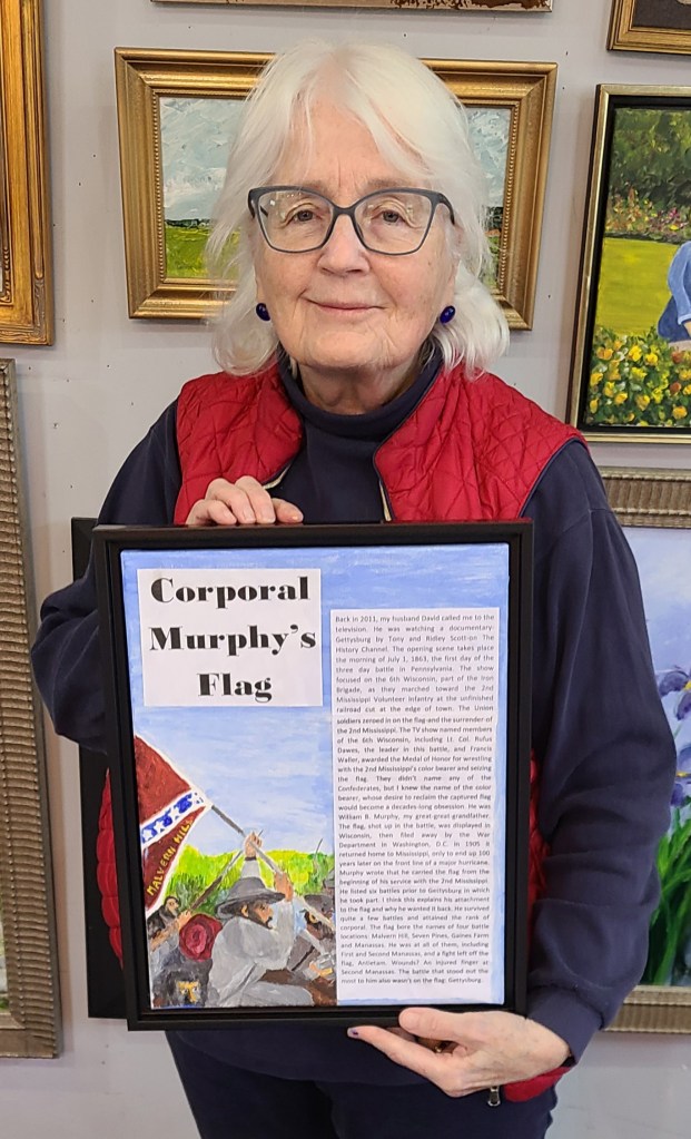 Dianne attends our weekly art classes and paints gifts for family members and friends. She just completed this very unusual one that features a Civil War flag. She wanted to include the story about the flag so she painted part of the canvas and mod podged the story. It turned out great…and I know the receipient will love it.