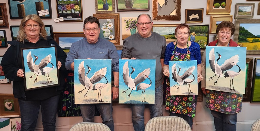 These terrific painters came out last night to paint our dancing cranes. Didn’t they do an amazing job???!!!! I love it when painters who come to The Studio are willing to take on a challenge. Great work everyone! Our next challenging painting is the Flying Pelicans coming up on April 30th. Check it out here.