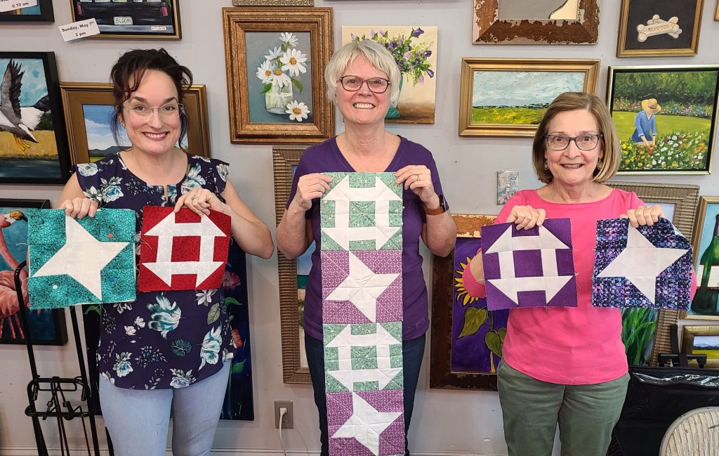 One group of our quilters worked on the Row Quilt yesterday. This row combined the Friendship Star and the Monkey Wrench. Nice job!!!!