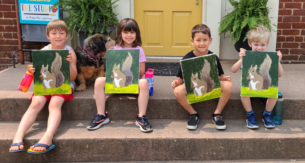 Did someone say Squirrel???!!!! Didn’t these 5 and 6 year old artists do amazing work on their squirrel paintings yesterday at The Studio???!!! Terrific. Our “Animal Affair” Art Camp ended yesterday but don’t worry there is much more camp this summer for kids. Next week we have a “Beach Party” session for ages 5-7. Click here to register your young painter. And check out all the other sessions coming up this summer by clicking this link.