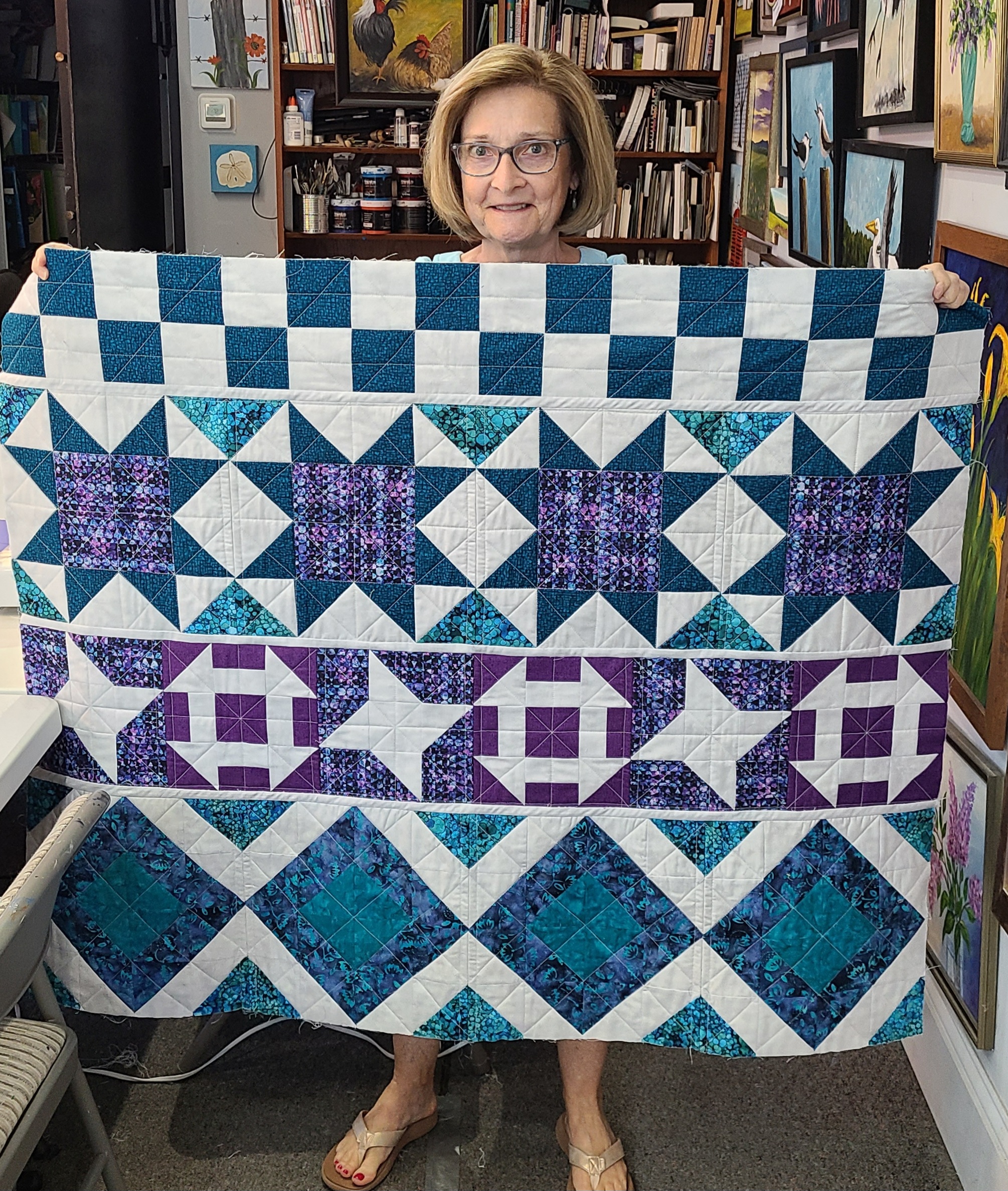 I completed this “Fancy Diamond” quilt top last month and was pleased with how it turned out. I took it to my longarm quilter, Wendy Hughes. When I got it back I was thrilled. Just look at the beautiful stitching she did on the blocks and neutral space. Wendy made a quilt that I was pleased with into a quilt that I am so delighted to have! Don’t you agree that it’s amazing????!!!!! Thanks Wendy…beautiful work!