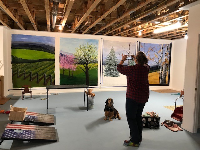 Dianne and I worked for 6 hours on the mural this weekend. We are getting very close now. She started painting frames around them while Lincoln supervised my touch-up and finals on the last panel. We still have a few more hours of detail work but it’s almost there.