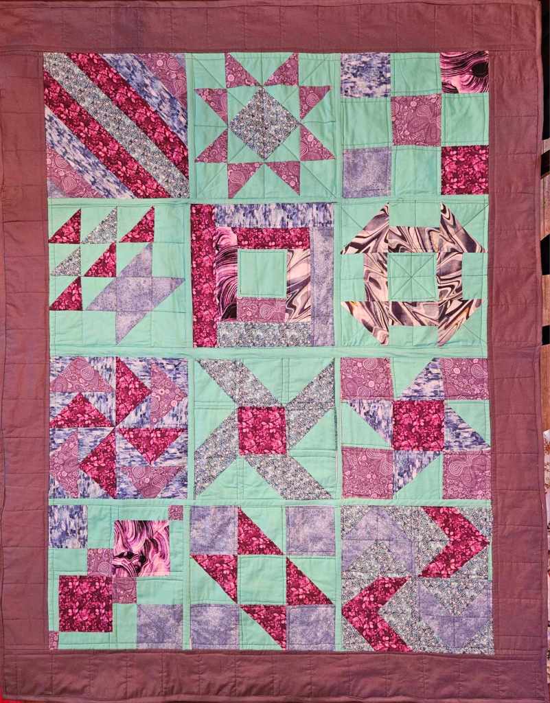 Sometimes you have thouse students who really want to learn and things get in the way and slow them down. This happened a couple of times in the course of this past year as we made The Sampler Quilt as You Go project at The Studio in Sierra’s class. But we kept moving ahead and she got that beautiful quilt finished. We met the day after Christmas for a few hours to get it all together and she took it home to bind and now it’s done so she can send it to the lucky recipient. Great job Sierra. I love the colors and can’t wait to see what you do next.