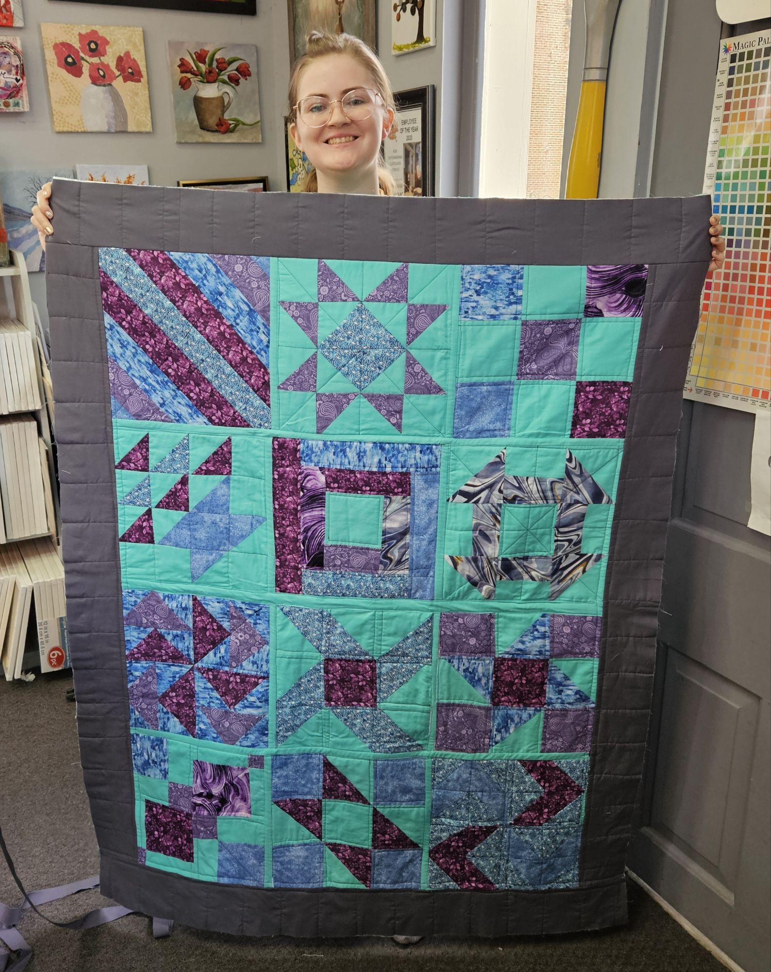 This is a photo of the completed quilt with binding. The color looks so different but the border really is grey as in the photo of Sierra above holding the quilt but you can get a look at it here.