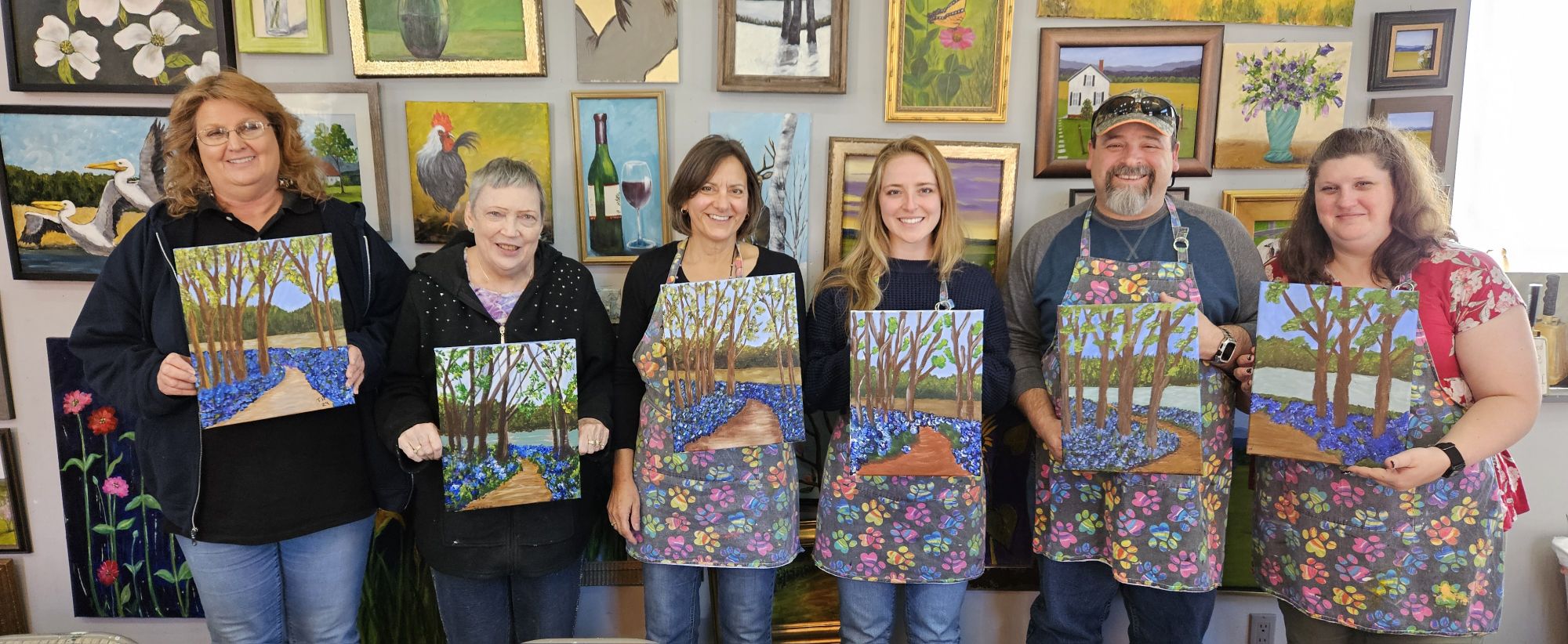 Our painters created these lovely “Bluebells by the River” paintings at yesterday’s Paint Party. Great! And it was fun having a couple work together to create the diptych so they can hang them together. That was fun! Check out the upcoming events at The Studio here.