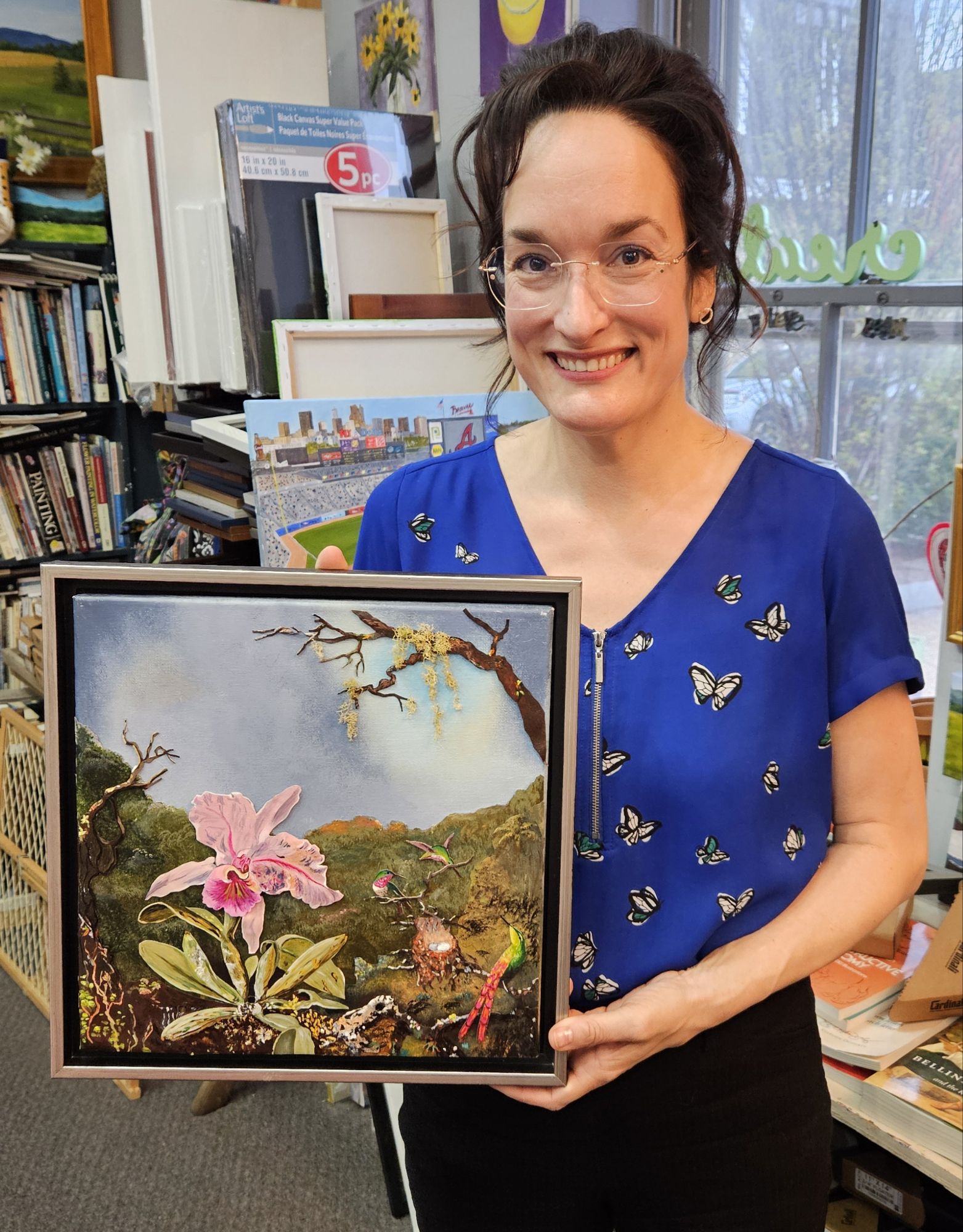 One of our Wednesday evening art students, Leslie, reimagined Martin Johnson Heade’s Cattleya Orchid and Three Hummingbirds from 1871 and made it her own by recreating it into a collage piece. She painted each small piece seperately and then adhered it to a canvas raising it slightly. The effect is amazing! She even used small bits of moss to dangle from the upper trees. Great work Leslie. The patience you exhibited really paid off. It’s fabulous!