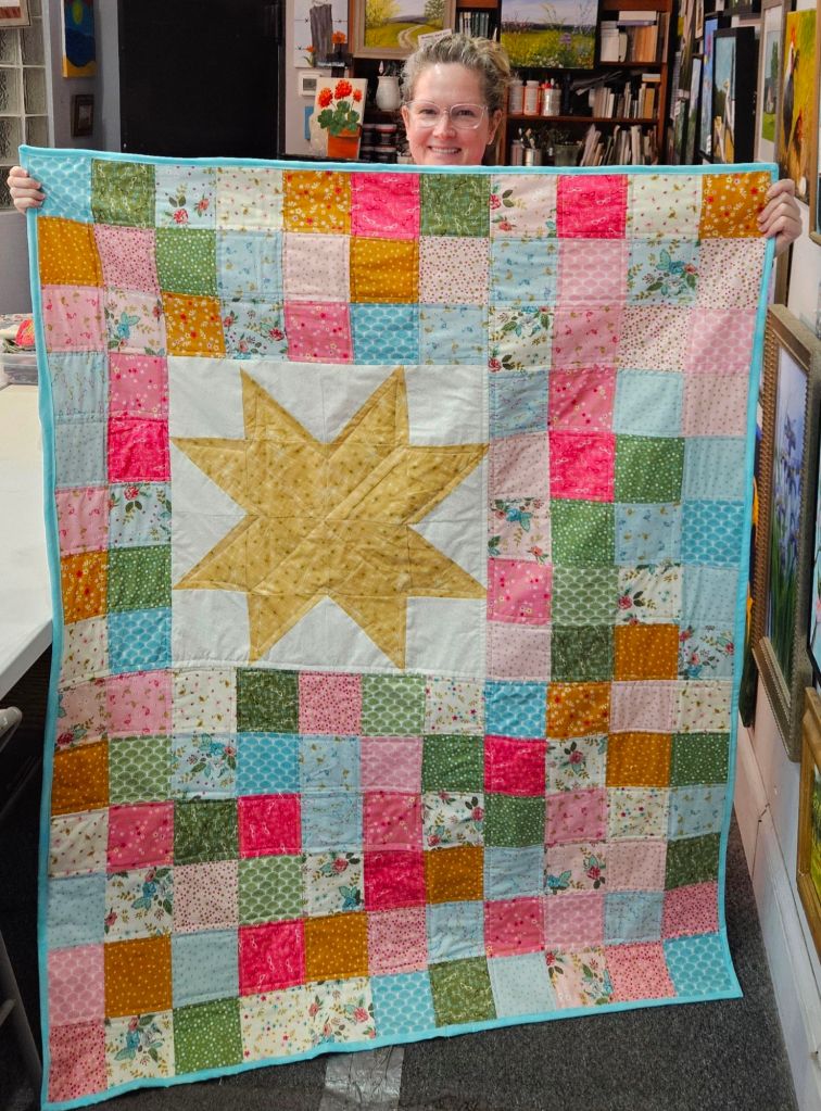 Tish just completed her first quilt…and isn’t it terrific???!!!! Great work Tish! If you have been wanting to learn to quilt watch for upcoming quilt classes at The Studio. Check out what we have on our calendar now by clicking here.