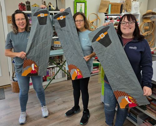 The Saturday Table Topper class made a Thanksgiving Table Runner….and it is so super CUTE! These will be so festive for the Thanksgiving holiday. Nice work ladies.